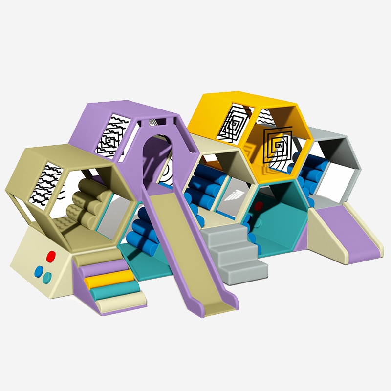 Este equipo de juego suave para interiores Hexagon Hive es un escalador de juego suave modular temático para niños. Sus módulos hexagonales en forma de colmena integran secciones de escalada, toboganes y elementos decorativos sensoriales (paneles estampados, almohadillas táctiles), combinando el juego activo con la exploración sensorial.